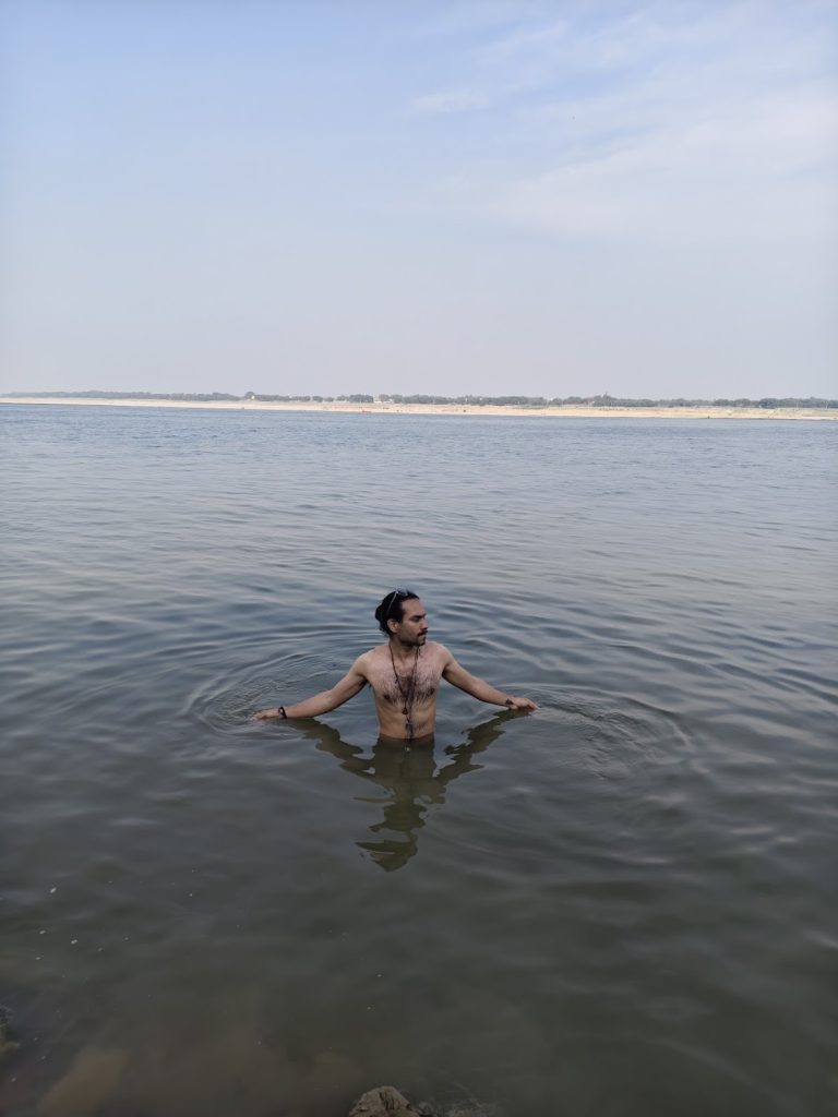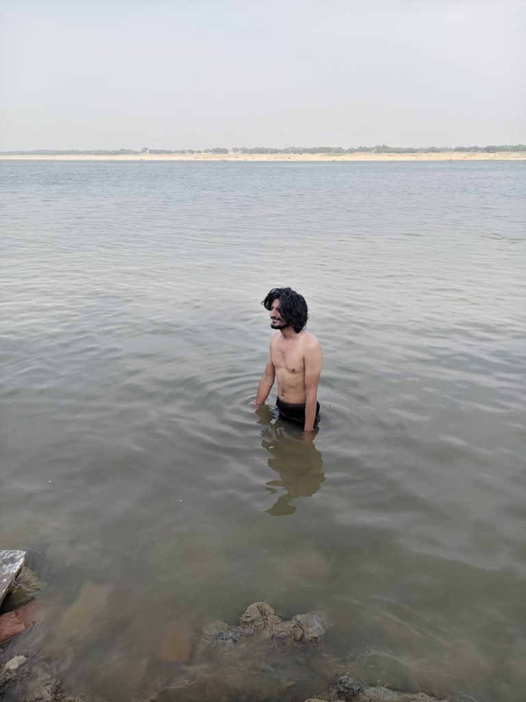 We decided to leave, and we ended up near the Ganga, which ran just a few steps from Pandit Jee’s house. This is the point where Ganga meets its tributary ahead of Assi.